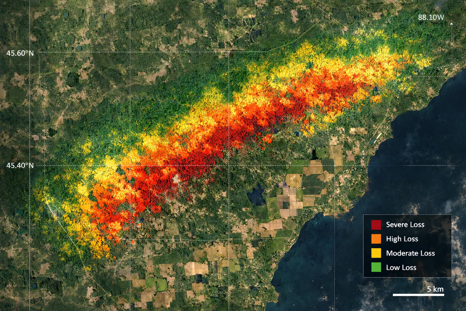 We deliver rapid post-event damage assessments using pre- and post-event satellite imagery, automated change detection, and impact mapping. Outputs can include damage severity maps, affected asset counts, exposure layers, and reporting tools to support faster response and recovery.